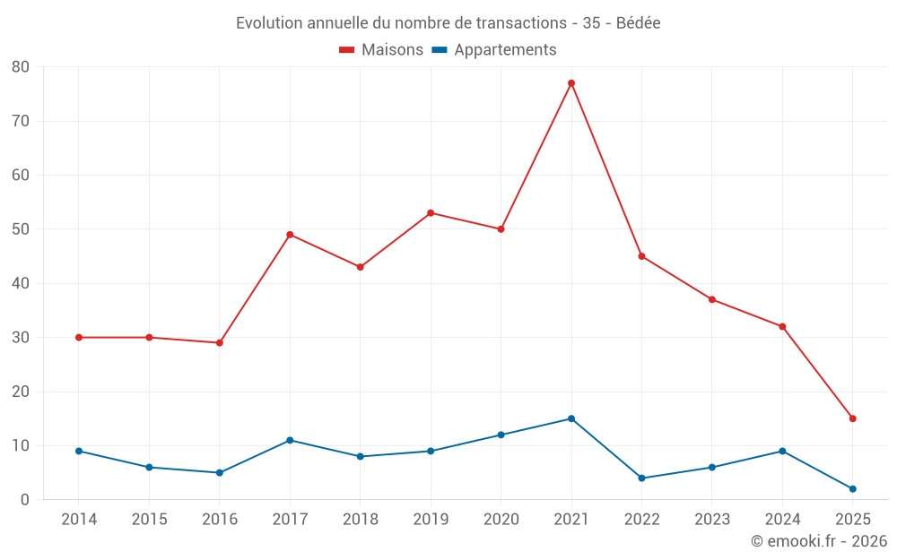 Le prix médian sur les 34 transactions de maisons des 12 derniers mois dans la commune de Bédée était de 2 550 € par mètre carré pour une valeur foncière médiane de 282 197 €. Sur cette période 60% des transactions se sont situées entre 1 837 et 2 765 € par mètre carré (du 2ème au 8ème déciles).