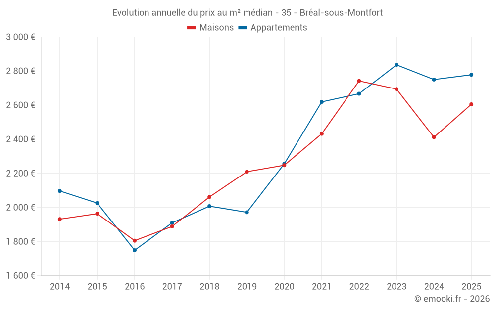 Le prix médian sur les 22 transactions de maisons des 6 derniers mois dans la commune de Bréal-sous-Montfort était de 2 605 € par mètre carré pour une valeur foncière médiane de 317 500 €. Sur cette période 60% des transactions se sont situées entre 2 115 et 2 860 € par mètre carré (du 2ème au 8ème déciles).