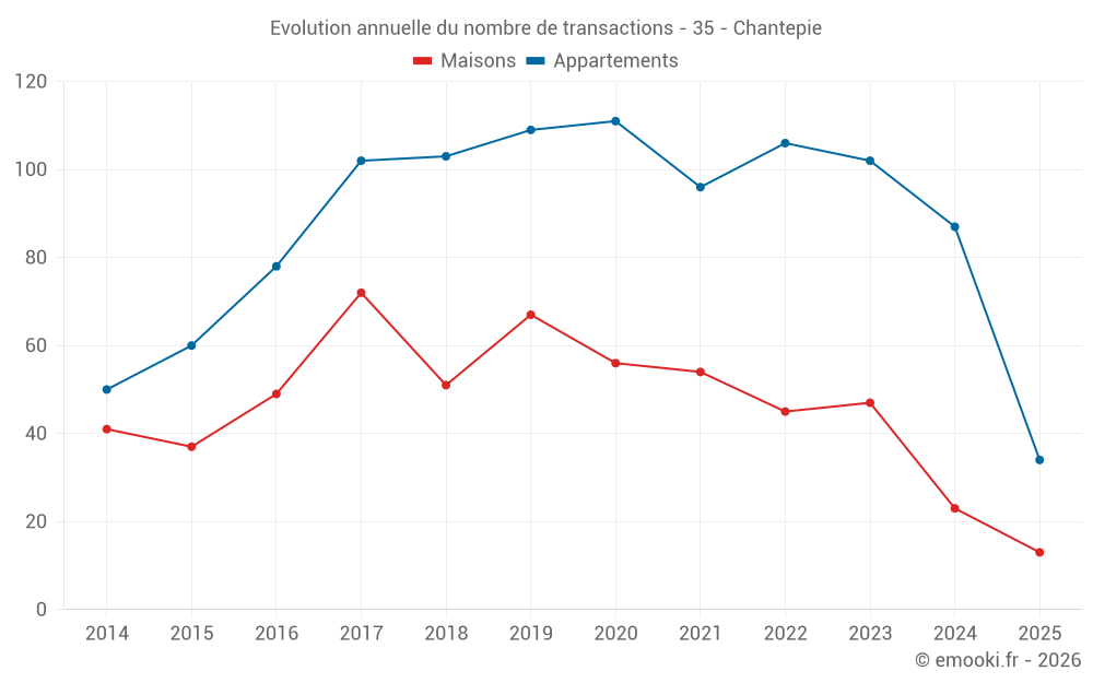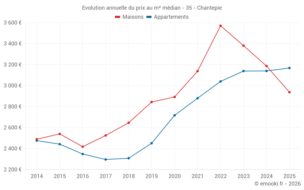 Le prix médian sur les 27 transactions de maisons des 12 derniers mois dans la commune de Chantepie était de 3 133 € par mètre carré pour une valeur foncière médiane de 330 000 €. Sur cette période 60% des transactions se sont situées entre 2 826 et 3 703 € par mètre carré (du 2ème au 8ème déciles).