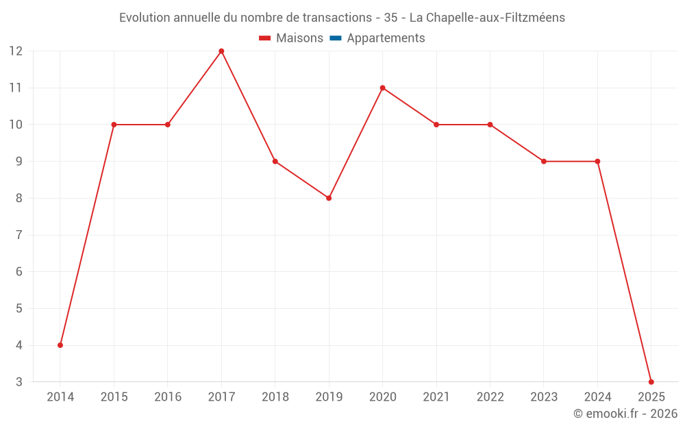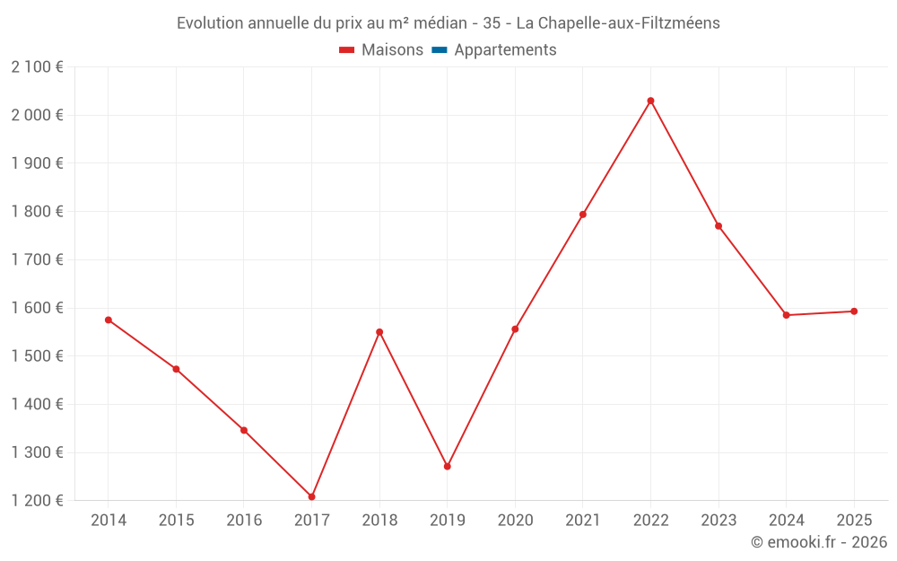 Le prix médian sur les 15 transactions de maisons des 24 derniers mois dans la commune de la Chapelle-aux-Filtzméens était de 1 593 € par mètre carré pour une valeur foncière médiane de 175 000 €. Sur cette période 60% des transactions se sont situées entre 1 034 et 2 078 € par mètre carré (du 2ème au 8ème déciles).