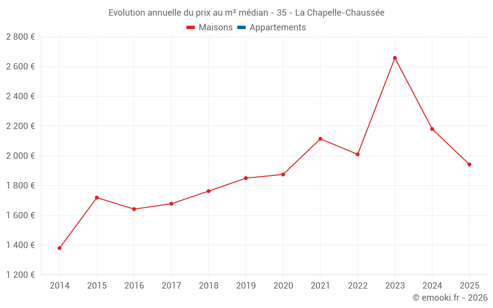 Le prix médian sur les 17 transactions de maisons des 24 derniers mois dans la commune de la Chapelle-Chaussée était de 2 109 € par mètre carré pour une valeur foncière médiane de 253 950 €. Sur cette période 60% des transactions se sont situées entre 1 694 et 2 578 € par mètre carré (du 2ème au 8ème déciles).