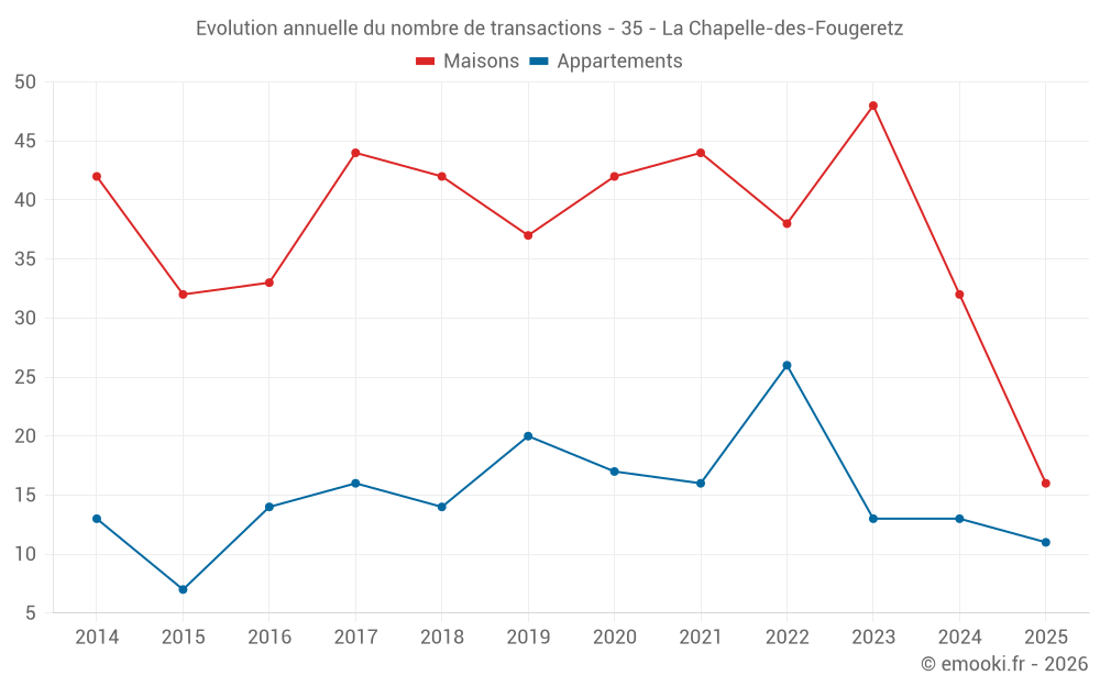 Le prix médian sur les 32 transactions de maisons des 12 derniers mois dans la commune de la Chapelle-des-Fougeretz était de 3 166 € par mètre carré pour une valeur foncière médiane de 318 382 €. Sur cette période 60% des transactions se sont situées entre 2 810 et 3 665 € par mètre carré (du 2ème au 8ème déciles).
