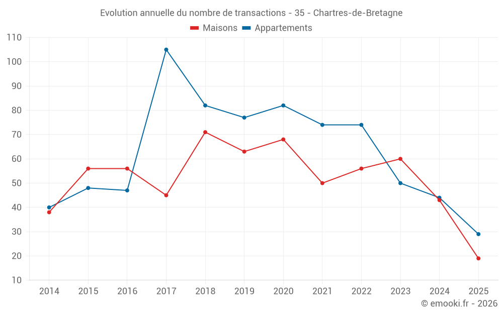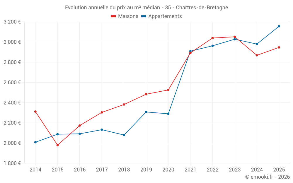 Le prix médian sur les 19 transactions de maisons des 6 derniers mois dans la commune de Chartres-de-Bretagne était de 2 947 € par mètre carré pour une valeur foncière médiane de 290 000 €. Sur cette période 60% des transactions se sont situées entre 2 493 et 3 340 € par mètre carré (du 2ème au 8ème déciles).