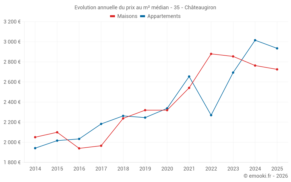 Le prix médian sur les 34 transactions de maisons des 6 derniers mois dans la commune de Châteaugiron était de 2 726 € par mètre carré pour une valeur foncière médiane de 292 650 €. Sur cette période 60% des transactions se sont situées entre 2 348 et 3 029 € par mètre carré (du 2ème au 8ème déciles).