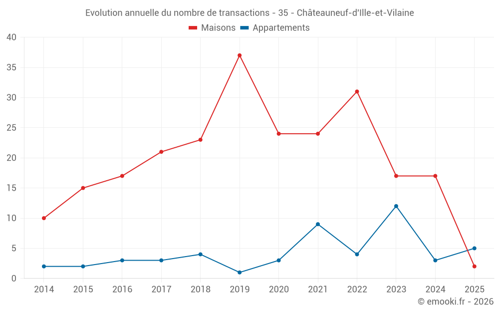 Le prix médian sur les 25 transactions de maisons des 24 derniers mois dans la commune de Châteauneuf-d'Ille-et-Vilaine était de 2 522 € par mètre carré pour une valeur foncière médiane de 246 700 €. Sur cette période 60% des transactions se sont situées entre 1 870 et 3 021 € par mètre carré (du 2ème au 8ème déciles).