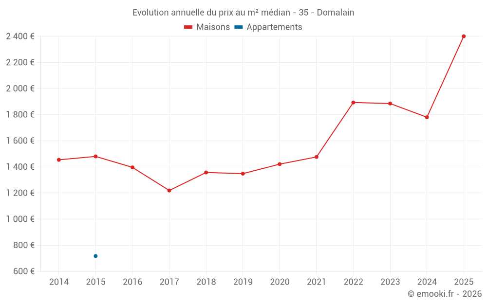 Le prix médian sur les 19 transactions de maisons des 12 derniers mois dans la commune de Domalain était de 1 815 € par mètre carré pour une valeur foncière médiane de 201 000 €. Sur cette période 60% des transactions se sont situées entre 1 556 et 2 395 € par mètre carré (du 2ème au 8ème déciles).