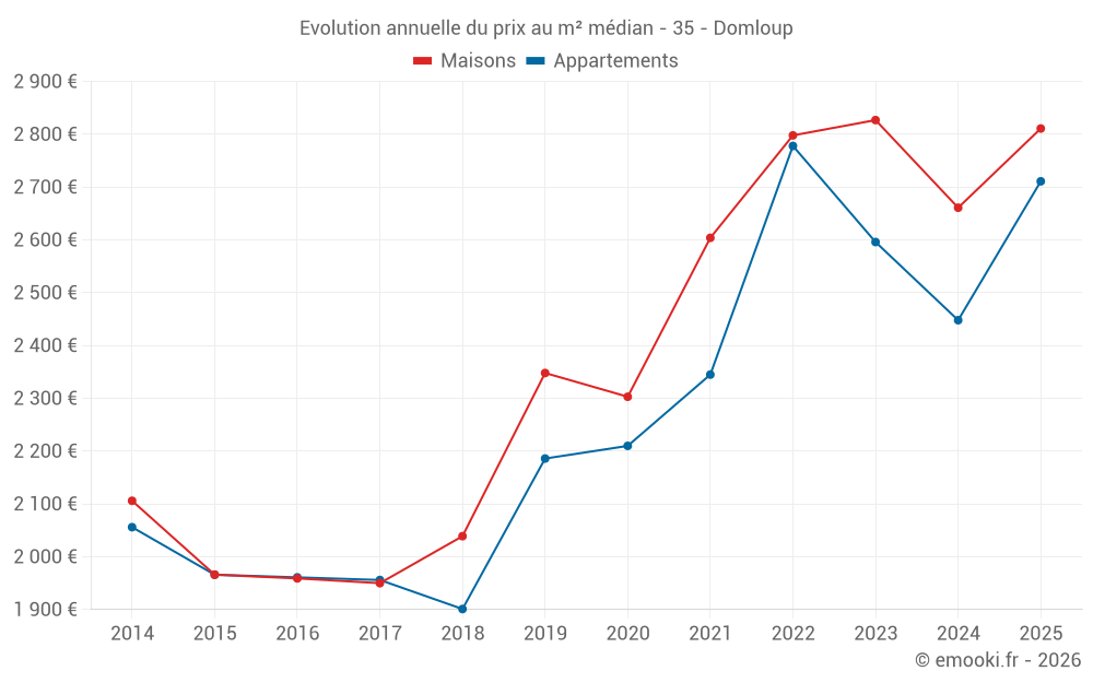 Le prix médian sur les 24 transactions de maisons des 12 derniers mois dans la commune de Domloup était de 2 658 € par mètre carré pour une valeur foncière médiane de 296 212 €. Sur cette période 60% des transactions se sont situées entre 2 183 et 3 064 € par mètre carré (du 2ème au 8ème déciles).