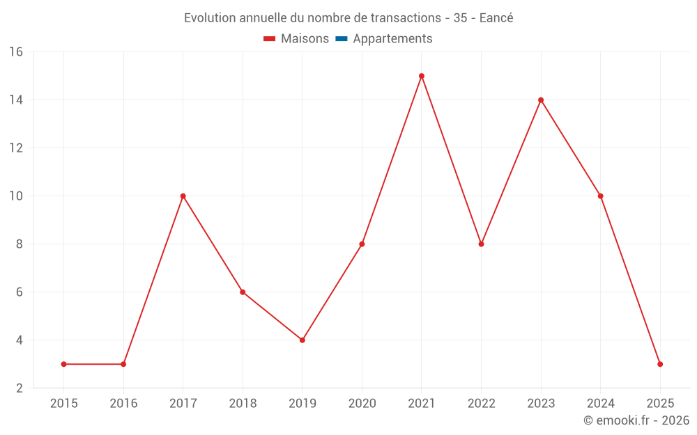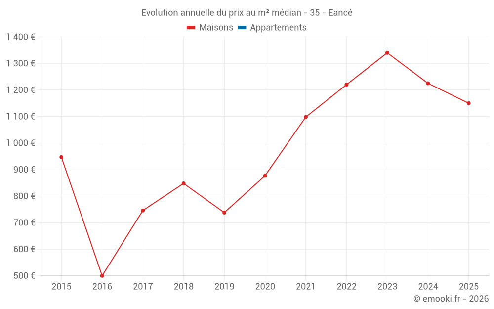 Le prix médian sur les 17 transactions de maisons des 24 derniers mois dans la commune d'Eancé était de 1 200 € par mètre carré pour une valeur foncière médiane de 144 000 €. Sur cette période 60% des transactions se sont situées entre 897 et 1 834 € par mètre carré (du 2ème au 8ème déciles).