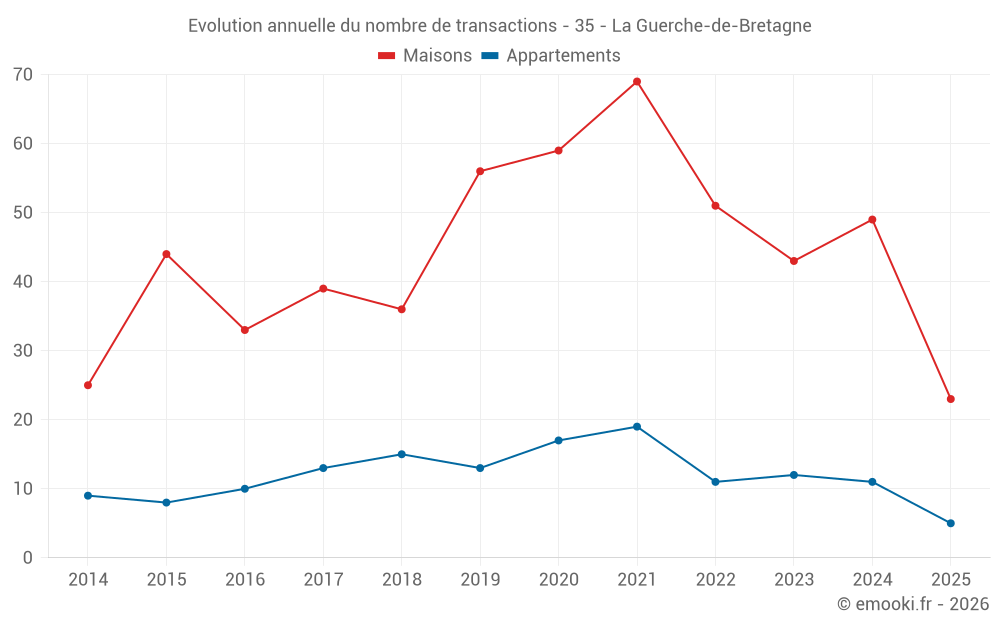 Le prix médian sur les 23 transactions de maisons des 6 derniers mois dans la commune de la Guerche-de-Bretagne était de 1 707 € par mètre carré pour une valeur foncière médiane de 158 305 €. Sur cette période 60% des transactions se sont situées entre 1 299 et 2 042 € par mètre carré (du 2ème au 8ème déciles).