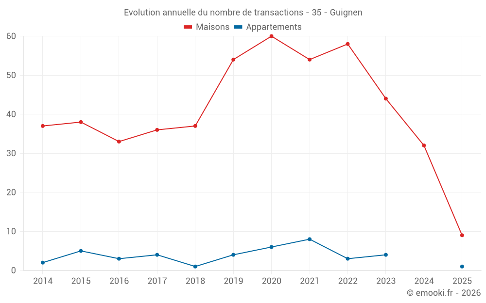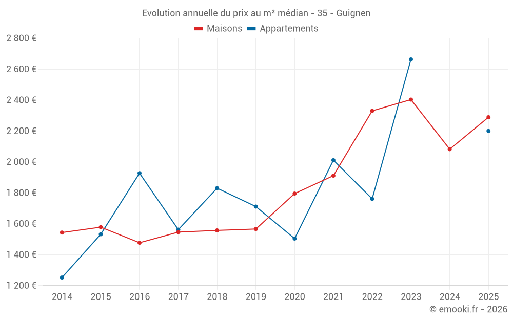 Le prix médian sur les 32 transactions de maisons des 12 derniers mois dans la commune de Guignen était de 2 165 € par mètre carré pour une valeur foncière médiane de 217 569 €. Sur cette période 60% des transactions se sont situées entre 1 766 et 2 479 € par mètre carré (du 2ème au 8ème déciles).