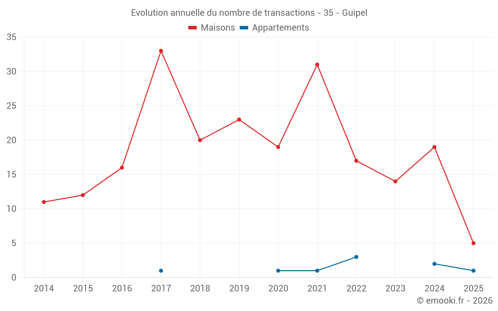 Le prix médian sur les 16 transactions de maisons des 12 derniers mois dans la commune de Guipel était de 2 038 € par mètre carré pour une valeur foncière médiane de 132 500 €. Sur cette période 60% des transactions se sont situées entre 1 288 et 2 190 € par mètre carré (du 2ème au 8ème déciles).