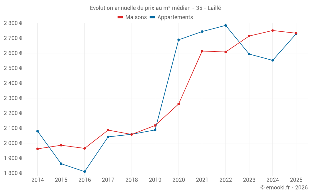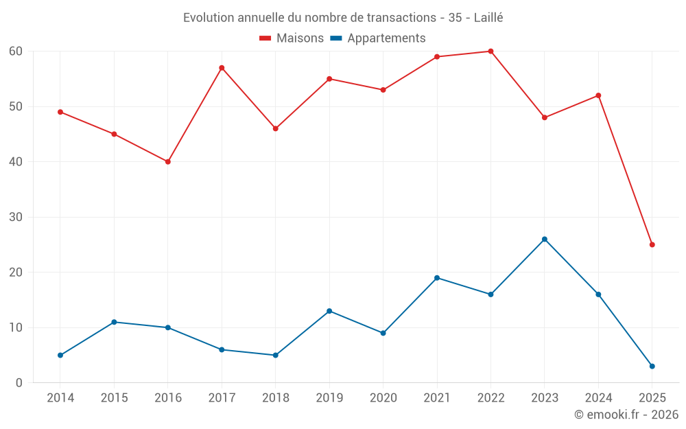 Le prix médian sur les 25 transactions de maisons des 6 derniers mois dans la commune de Laillé était de 2 733 € par mètre carré pour une valeur foncière médiane de 358 000 €. Sur cette période 60% des transactions se sont situées entre 2 521 et 3 057 € par mètre carré (du 2ème au 8ème déciles).