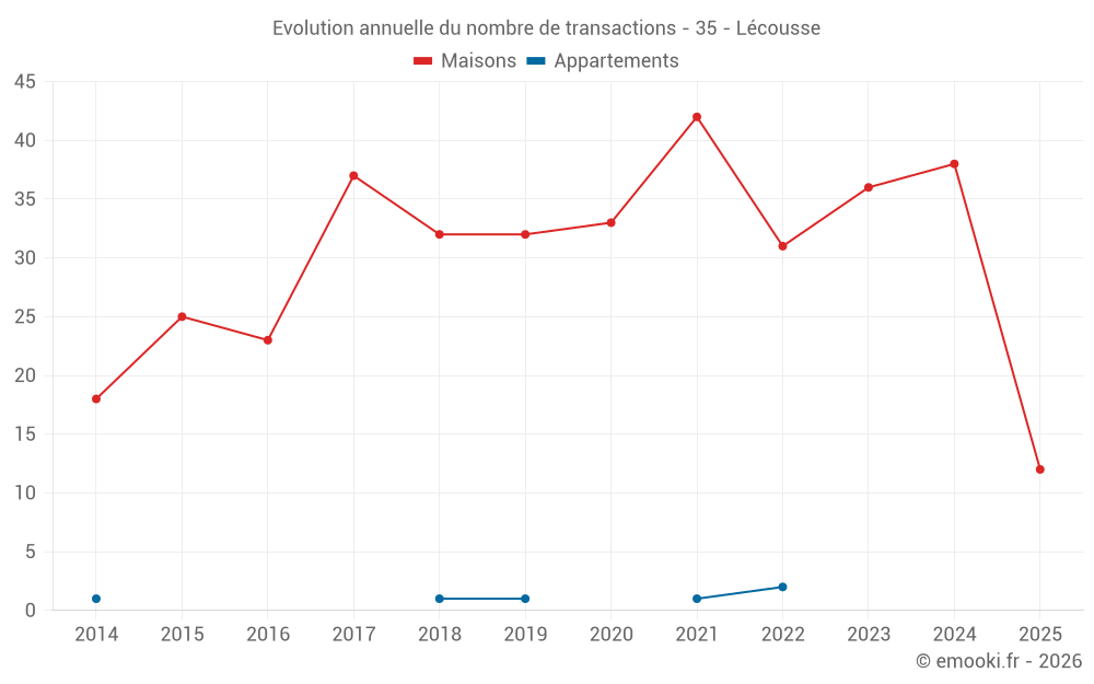 Le prix médian sur les 35 transactions de maisons des 12 derniers mois dans la commune de Lécousse était de 2 278 € par mètre carré pour une valeur foncière médiane de 218 000 €. Sur cette période 60% des transactions se sont situées entre 1 907 et 2 975 € par mètre carré (du 2ème au 8ème déciles).
