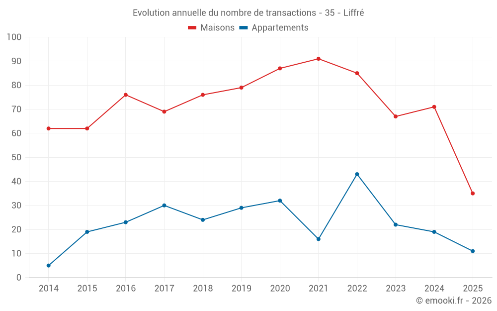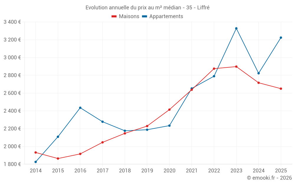 Le prix médian sur les 35 transactions de maisons des 6 derniers mois dans la commune de Liffré était de 2 650 € par mètre carré pour une valeur foncière médiane de 308 370 €. Sur cette période 60% des transactions se sont situées entre 2 418 et 3 250 € par mètre carré (du 2ème au 8ème déciles).
