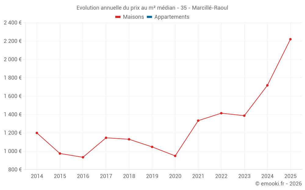 Le prix médian sur les 23 transactions de maisons des 24 derniers mois dans la commune de Marcillé-Raoul était de 1 633 € par mètre carré pour une valeur foncière médiane de 170 000 €. Sur cette période 60% des transactions se sont situées entre 1 082 et 2 104 € par mètre carré (du 2ème au 8ème déciles).