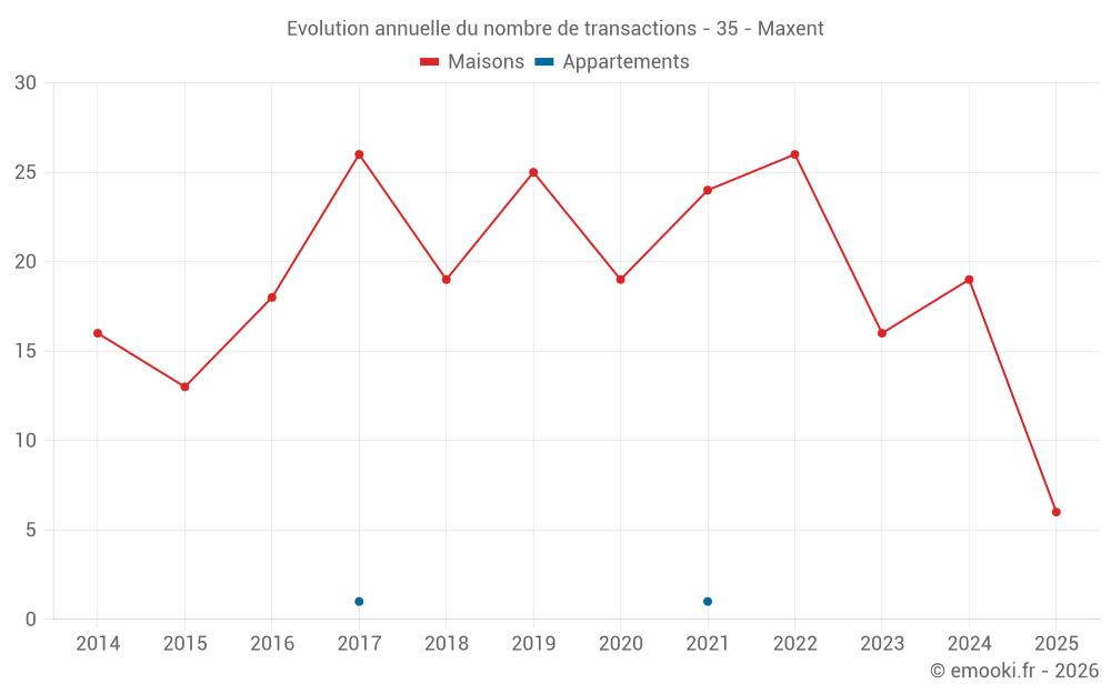 Le prix médian sur les 16 transactions de maisons des 12 derniers mois dans la commune de Maxent était de 1 676 € par mètre carré pour une valeur foncière médiane de 171 100 €. Sur cette période 60% des transactions se sont situées entre 1 164 et 2 363 € par mètre carré (du 2ème au 8ème déciles).