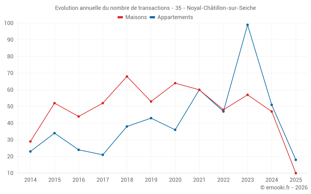 Le prix médian sur les 39 transactions de maisons des 12 derniers mois dans la commune de Noyal-Châtillon-sur-Seiche était de 2 766 € par mètre carré pour une valeur foncière médiane de 315 000 €. Sur cette période 60% des transactions se sont situées entre 2 302 et 3 213 € par mètre carré (du 2ème au 8ème déciles).