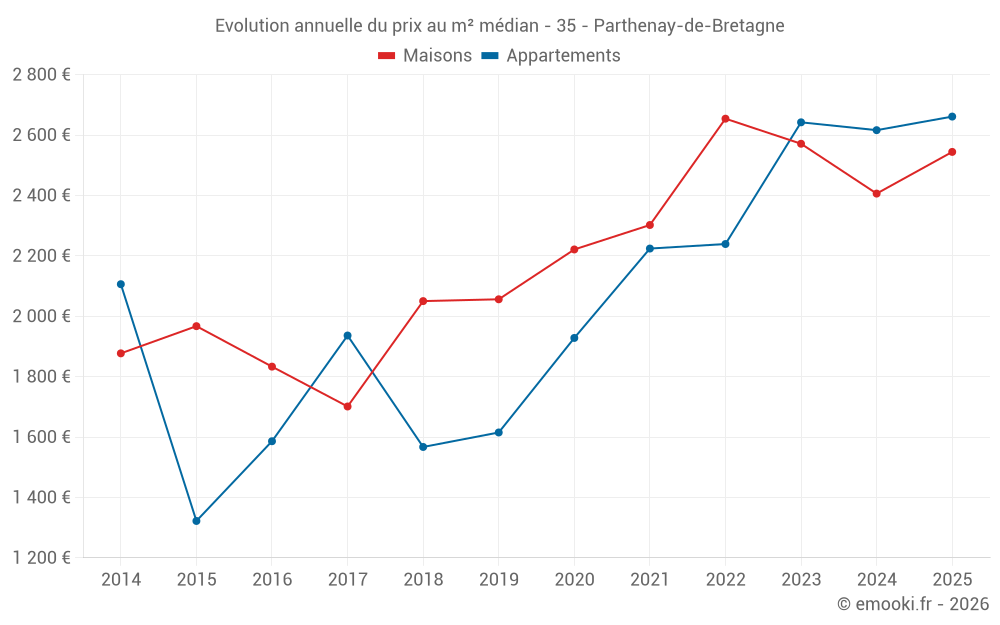Le prix médian sur les 25 transactions de maisons des 24 derniers mois dans la commune de Parthenay-de-Bretagne était de 2 566 € par mètre carré pour une valeur foncière médiane de 283 500 €. Sur cette période 60% des transactions se sont situées entre 1 888 et 2 770 € par mètre carré (du 2ème au 8ème déciles).