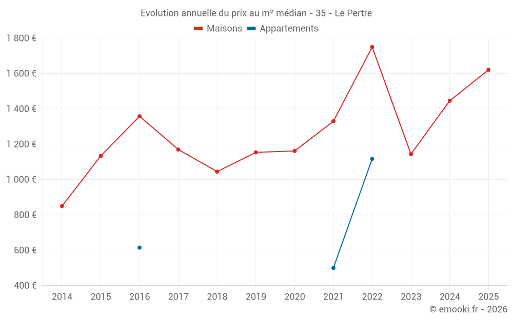 Le prix médian sur les 29 transactions de maisons des 24 derniers mois dans la commune du Pertre était de 1 463 € par mètre carré pour une valeur foncière médiane de 142 500 €. Sur cette période 60% des transactions se sont situées entre 899 et 1 989 € par mètre carré (du 2ème au 8ème déciles).