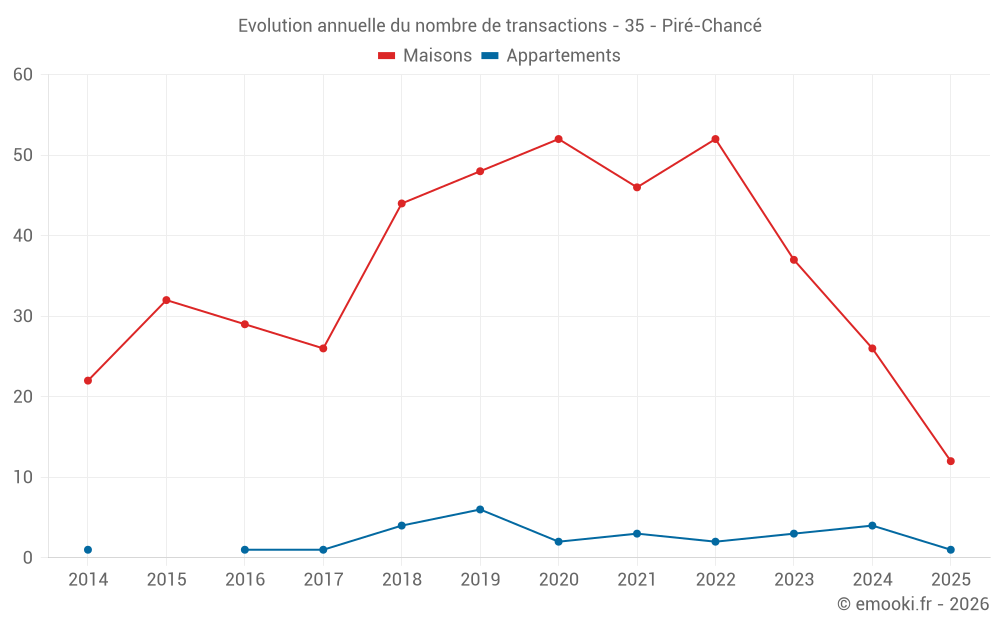 Le prix médian sur les 28 transactions de maisons des 12 derniers mois dans la commune de Piré-Chancé était de 2 352 € par mètre carré pour une valeur foncière médiane de 236 950 €. Sur cette période 60% des transactions se sont situées entre 1 697 et 3 019 € par mètre carré (du 2ème au 8ème déciles).