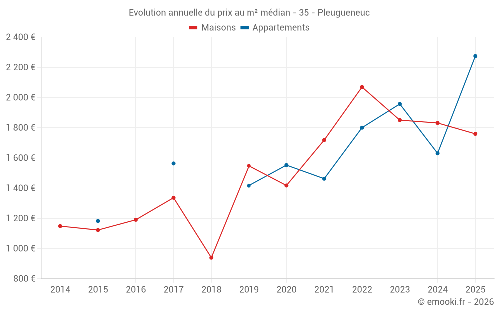 Le prix médian sur les 17 transactions de maisons des 12 derniers mois dans la commune de Pleugueneuc était de 1 869 € par mètre carré pour une valeur foncière médiane de 194 870 €. Sur cette période 60% des transactions se sont situées entre 1 512 et 2 339 € par mètre carré (du 2ème au 8ème déciles).