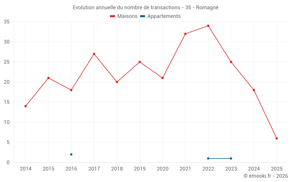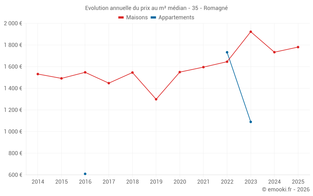 Le prix médian sur les 17 transactions de maisons des 12 derniers mois dans la commune de Romagné était de 1 655 € par mètre carré pour une valeur foncière médiane de 180 000 €. Sur cette période 60% des transactions se sont situées entre 1 213 et 2 064 € par mètre carré (du 2ème au 8ème déciles).