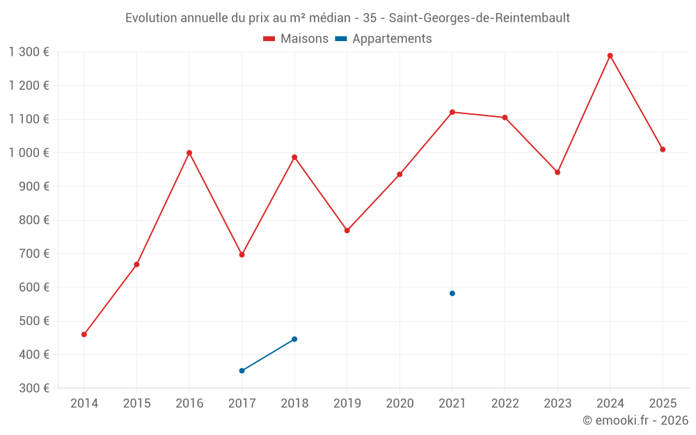 Le prix médian sur les 30 transactions de maisons des 12 derniers mois dans la commune de Saint-Georges-de-Reintembault était de 1 205 € par mètre carré pour une valeur foncière médiane de 127 442 €. Sur cette période 60% des transactions se sont situées entre 787 et 1 735 € par mètre carré (du 2ème au 8ème déciles).