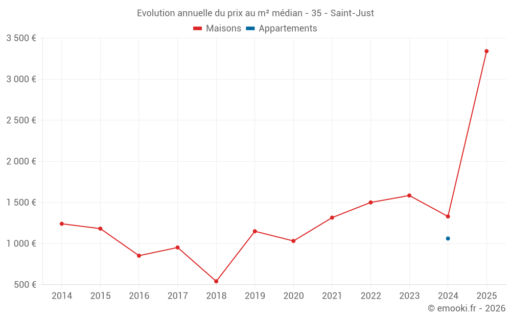 Le prix médian sur les 28 transactions de maisons des 24 derniers mois dans la commune de Saint-Just était de 1 554 € par mètre carré pour une valeur foncière médiane de 161 200 €. Sur cette période 60% des transactions se sont situées entre 1 138 et 1 953 € par mètre carré (du 2ème au 8ème déciles).