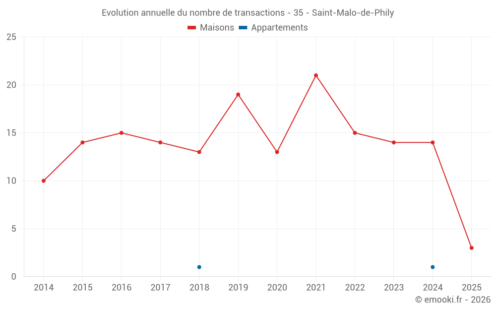 Le prix médian sur les 26 transactions de maisons des 24 derniers mois dans la commune de Saint-Malo-de-Phily était de 1 688 € par mètre carré pour une valeur foncière médiane de 122 500 €. Sur cette période 60% des transactions se sont situées entre 947 et 2 025 € par mètre carré (du 2ème au 8ème déciles).