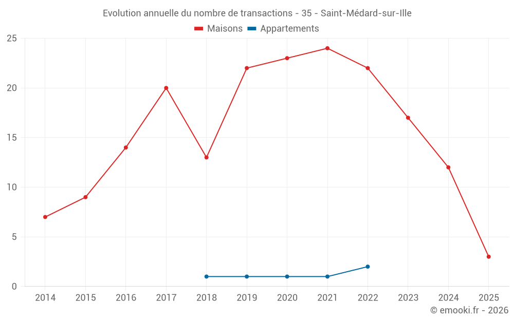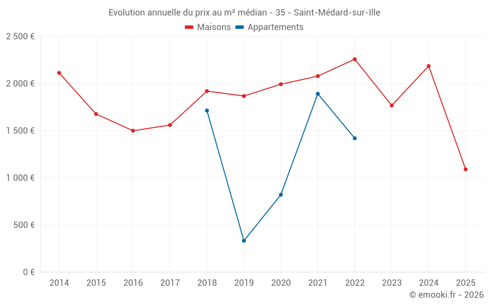 Le prix médian sur les 23 transactions de maisons des 24 derniers mois dans la commune de Saint-Médard-sur-Ille était de 2 035 € par mètre carré pour une valeur foncière médiane de 175 000 €. Sur cette période 60% des transactions se sont situées entre 1 102 et 2 519 € par mètre carré (du 2ème au 8ème déciles).