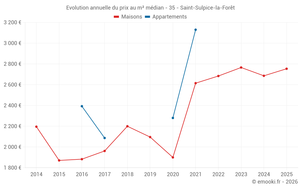 Le prix médian sur les 14 transactions de maisons des 24 derniers mois dans la commune de Saint-Sulpice-la-Forêt était de 2 708 € par mètre carré pour une valeur foncière médiane de 299 500 €. Sur cette période 60% des transactions se sont situées entre 2 068 et 3 105 € par mètre carré (du 2ème au 8ème déciles).