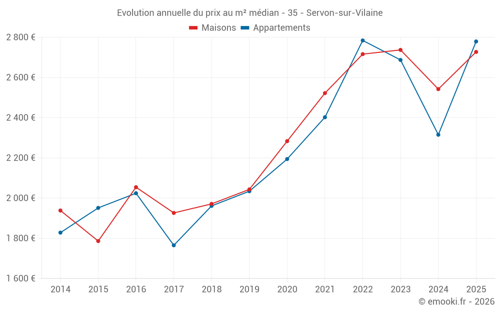 Le prix médian sur les 34 transactions de maisons des 12 derniers mois dans la commune de Servon-sur-Vilaine était de 2 675 € par mètre carré pour une valeur foncière médiane de 288 760 €. Sur cette période 60% des transactions se sont situées entre 2 290 et 3 019 € par mètre carré (du 2ème au 8ème déciles).