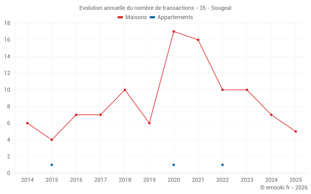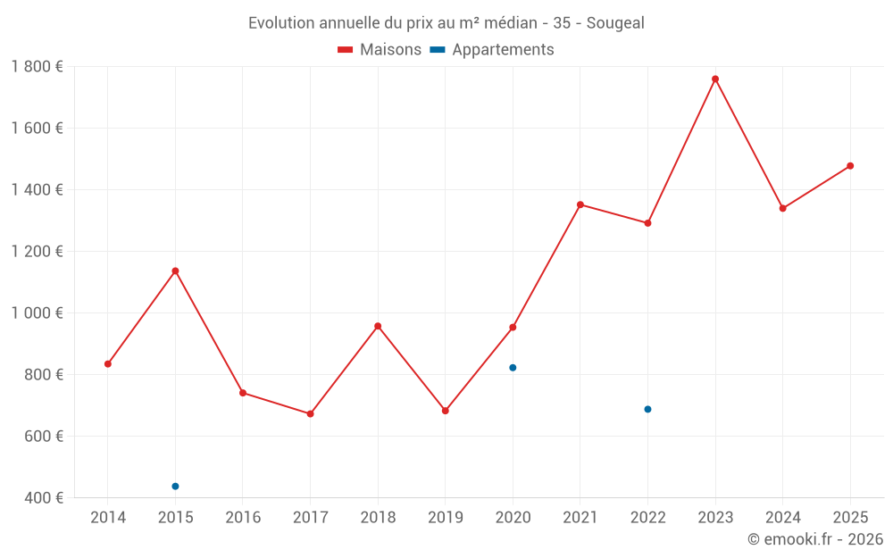Le prix médian sur les 19 transactions de maisons des 24 derniers mois dans la commune de Sougeal était de 1 422 € par mètre carré pour une valeur foncière médiane de 108 000 €. Sur cette période 60% des transactions se sont situées entre 1 153 et 1 805 € par mètre carré (du 2ème au 8ème déciles).