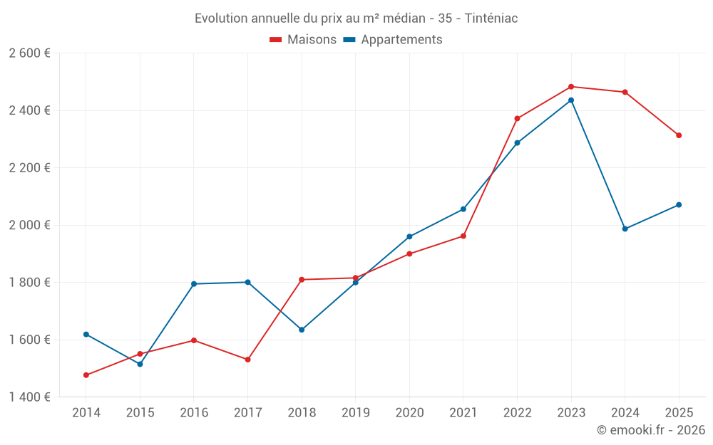 Le prix médian sur les 31 transactions de maisons des 12 derniers mois dans la commune de Tinténiac était de 2 320 € par mètre carré pour une valeur foncière médiane de 230 000 €. Sur cette période 60% des transactions se sont situées entre 1 856 et 2 706 € par mètre carré (du 2ème au 8ème déciles).