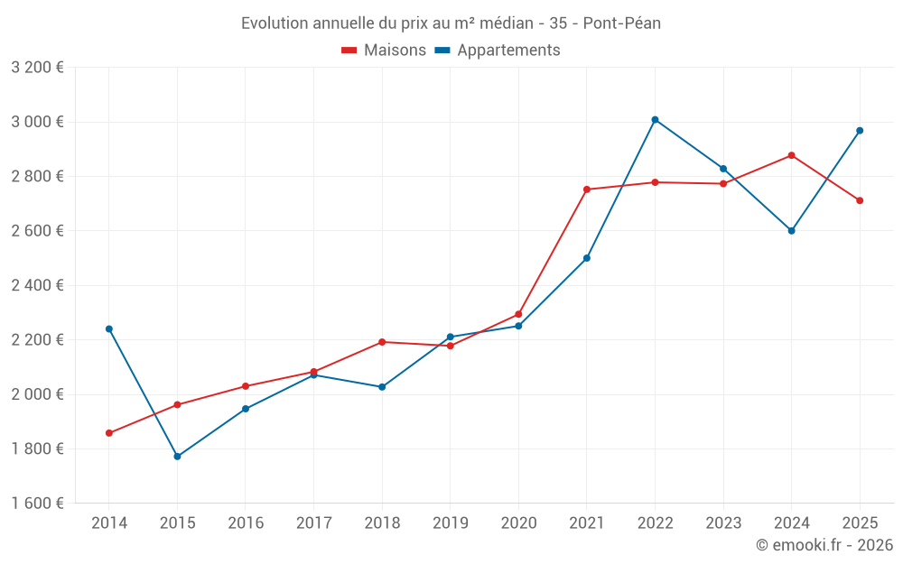 Le prix médian sur les 26 transactions de maisons des 12 derniers mois dans la commune de Pont-Péan était de 2 881 € par mètre carré pour une valeur foncière médiane de 267 712 €. Sur cette période 60% des transactions se sont situées entre 2 281 et 3 178 € par mètre carré (du 2ème au 8ème déciles).