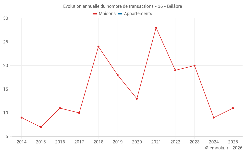 Le prix médian sur les 19 transactions de maisons des 12 derniers mois dans la commune de Bélâbre était de 750 € par mètre carré pour une valeur foncière médiane de 78 500 €. Sur cette période 60% des transactions se sont situées entre 397 et 1 222 € par mètre carré (du 2ème au 8ème déciles).