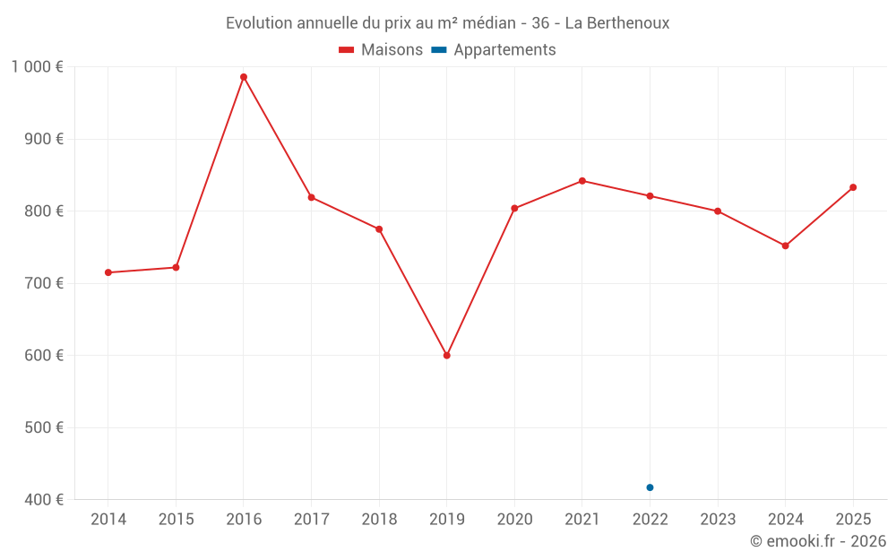 Le prix médian sur les 18 transactions de maisons des 24 derniers mois dans la commune de la Berthenoux était de 776 € par mètre carré pour une valeur foncière médiane de 91 000 €. Sur cette période 60% des transactions se sont situées entre 614 et 1 154 € par mètre carré (du 2ème au 8ème déciles).