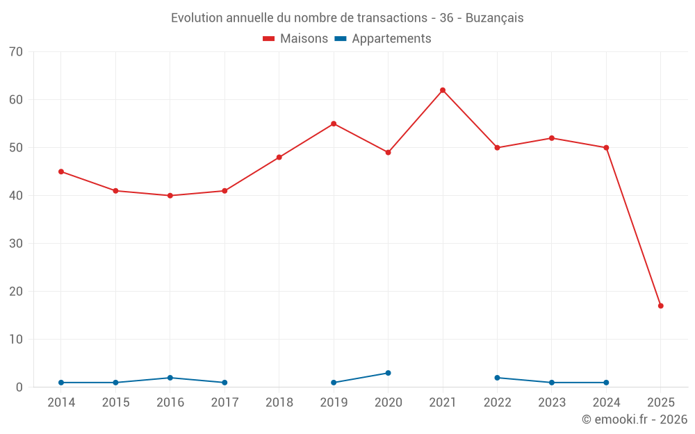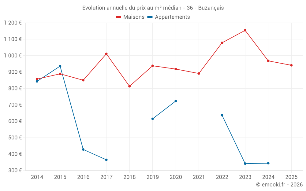Le prix médian sur les 45 transactions de maisons des 12 derniers mois dans la commune de Buzançais était de 929 € par mètre carré pour une valeur foncière médiane de 60 000 €. Sur cette période 60% des transactions se sont situées entre 511 et 1 386 € par mètre carré (du 2ème au 8ème déciles).