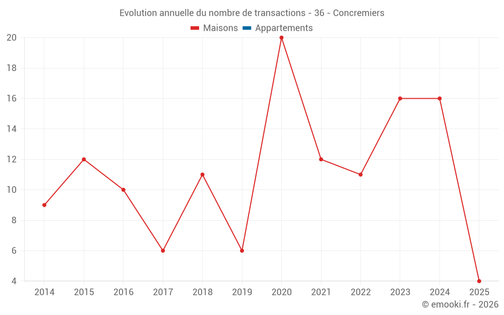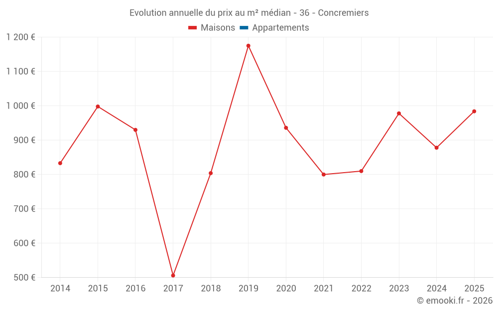 Le prix médian sur les 24 transactions de maisons des 24 derniers mois dans la commune de Concremiers était de 910 € par mètre carré pour une valeur foncière médiane de 65 550 €. Sur cette période 60% des transactions se sont situées entre 441 et 1 175 € par mètre carré (du 2ème au 8ème déciles).