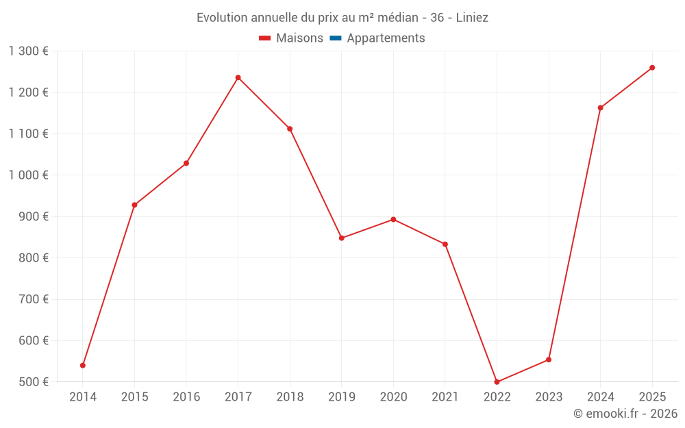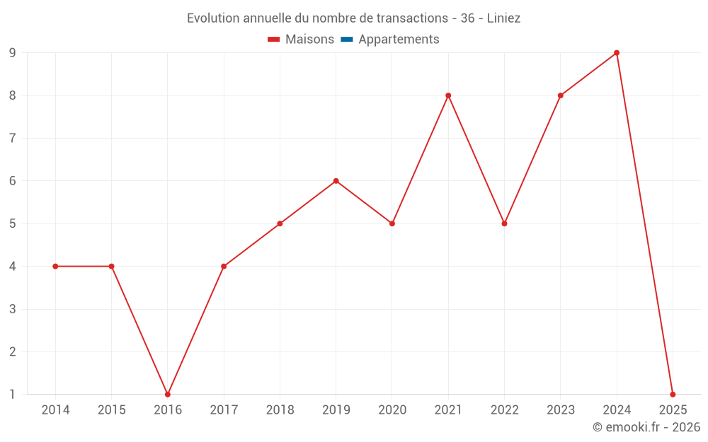 Le prix médian sur les 15 transactions de maisons des 24 derniers mois dans la commune de Liniez était de 1 111 € par mètre carré pour une valeur foncière médiane de 104 940 €. Sur cette période 60% des transactions se sont situées entre 719 et 1 420 € par mètre carré (du 2ème au 8ème déciles).