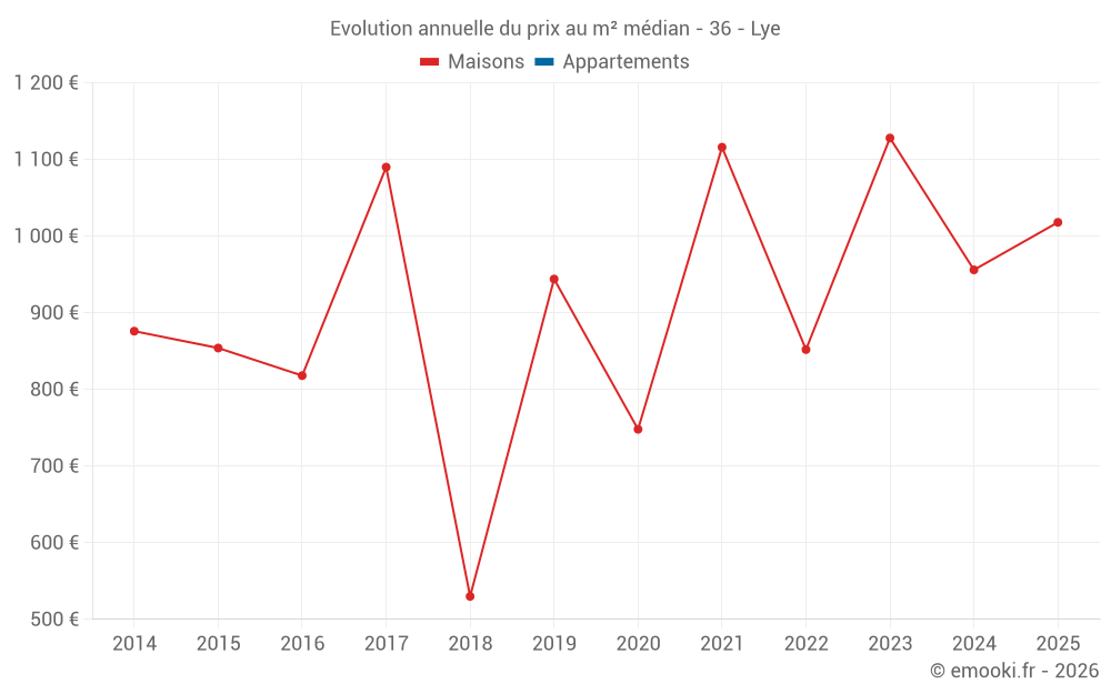 Le prix médian sur les 29 transactions de maisons des 24 derniers mois dans la commune de Lye était de 1 066 € par mètre carré pour une valeur foncière médiane de 100 000 €. Sur cette période 60% des transactions se sont situées entre 755 et 1 494 € par mètre carré (du 2ème au 8ème déciles).