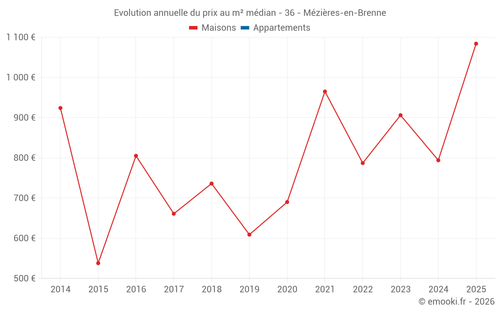 Le prix médian sur les 18 transactions de maisons des 12 derniers mois dans la commune de Mézières-en-Brenne était de 794 € par mètre carré pour une valeur foncière médiane de 73 500 €. Sur cette période 60% des transactions se sont situées entre 574 et 1 126 € par mètre carré (du 2ème au 8ème déciles).