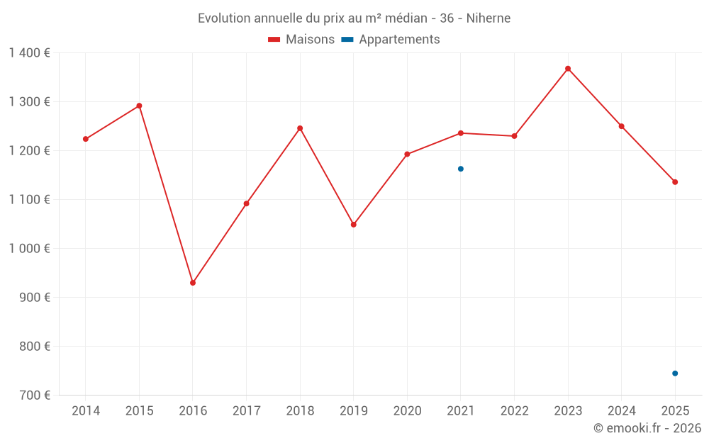 Le prix médian sur les 31 transactions de maisons des 24 derniers mois dans la commune de Niherne était de 1 237 € par mètre carré pour une valeur foncière médiane de 125 000 €. Sur cette période 60% des transactions se sont situées entre 975 et 1 744 € par mètre carré (du 2ème au 8ème déciles).