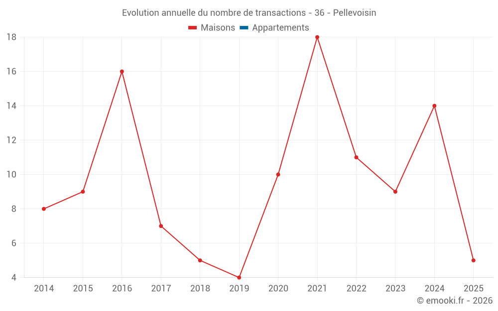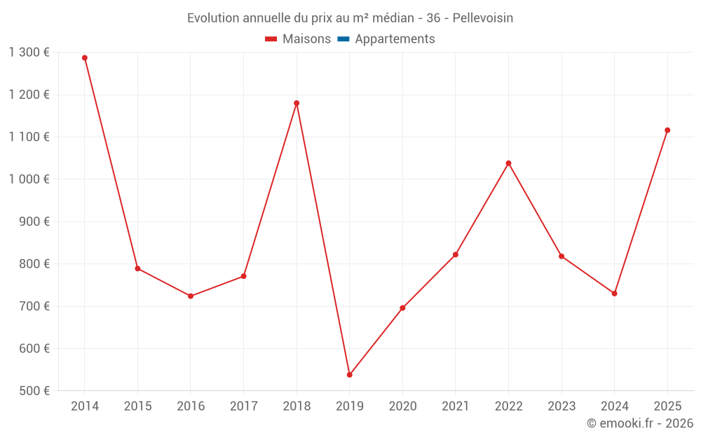Le prix médian sur les 23 transactions de maisons des 24 derniers mois dans la commune de Pellevoisin était de 833 € par mètre carré pour une valeur foncière médiane de 62 500 €. Sur cette période 60% des transactions se sont situées entre 464 et 1 216 € par mètre carré (du 2ème au 8ème déciles).