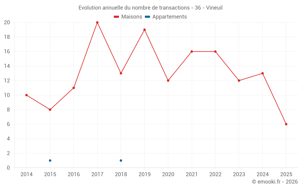 Le prix médian sur les 25 transactions de maisons des 24 derniers mois dans la commune de Vineuil était de 1 227 € par mètre carré pour une valeur foncière médiane de 135 000 €. Sur cette période 60% des transactions se sont situées entre 904 et 1 871 € par mètre carré (du 2ème au 8ème déciles).