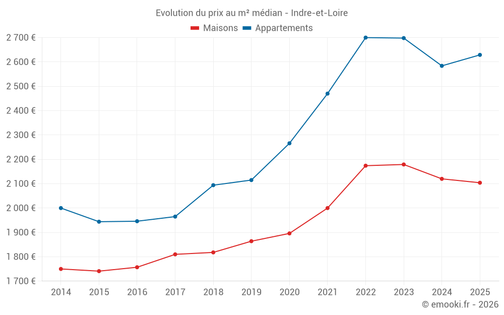 Le prix médian sur les 498 transactions d'appartements des 3 derniers mois dans le département d'Indre-et-Loire était de 2 664 € par mètre carré pour une valeur foncière médiane de 124 635 €. Sur cette période 60% des transactions se sont situées entre 1 765 et 3 325 € par mètre carré (du 2ème au 8ème déciles).