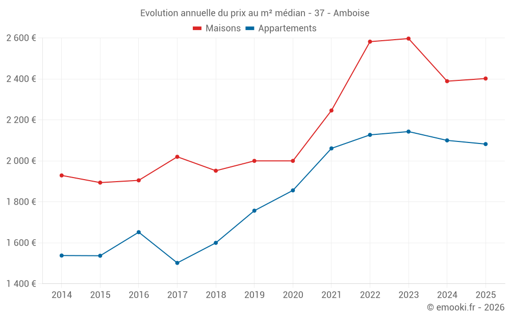 Le prix médian sur les 27 transactions de maisons des 3 derniers mois dans la commune d'Amboise était de 2 403 € par mètre carré pour une valeur foncière médiane de 240 000 €. Sur cette période 60% des transactions se sont situées entre 1 733 et 3 220 € par mètre carré (du 2ème au 8ème déciles).
