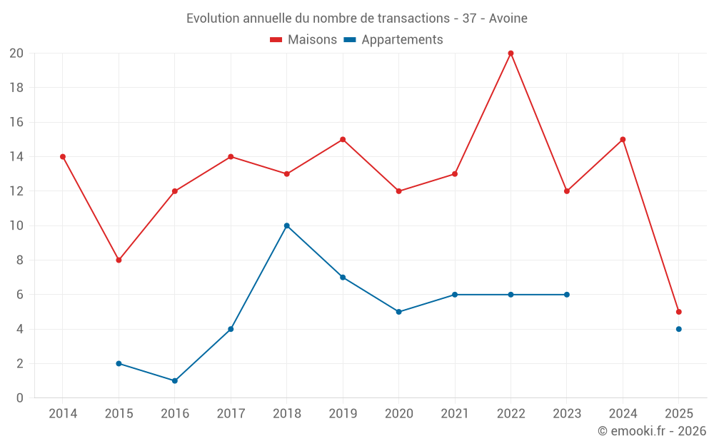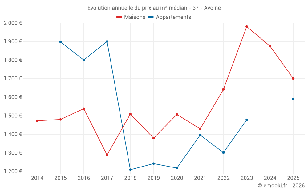 Le prix médian sur les 26 transactions de maisons des 24 derniers mois dans la commune d'Avoine était de 1 830 € par mètre carré pour une valeur foncière médiane de 175 000 €. Sur cette période 60% des transactions se sont situées entre 1 417 et 2 162 € par mètre carré (du 2ème au 8ème déciles).