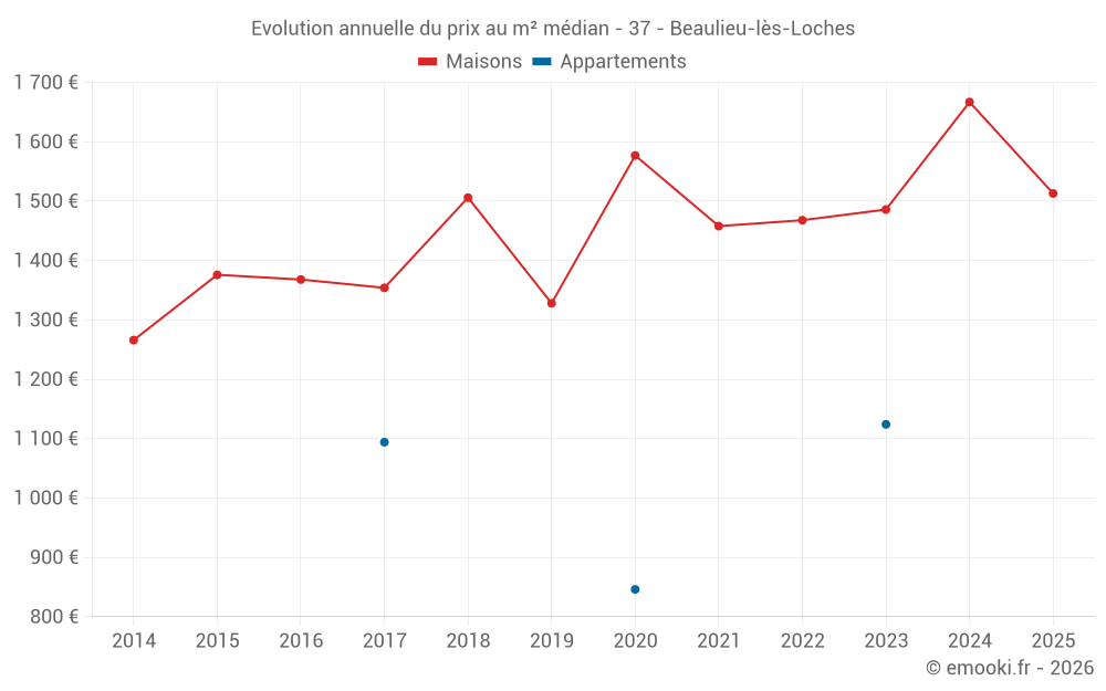 Le prix médian sur les 22 transactions de maisons des 12 derniers mois dans la commune de Beaulieu-lès-Loches était de 1 566 € par mètre carré pour une valeur foncière médiane de 175 000 €. Sur cette période 60% des transactions se sont situées entre 1 373 et 2 119 € par mètre carré (du 2ème au 8ème déciles).