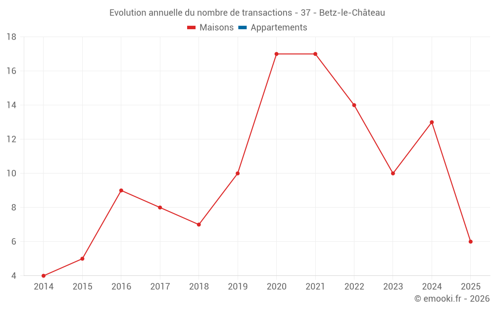 Le prix médian sur les 20 transactions de maisons des 24 derniers mois dans la commune de Betz-le-Château était de 900 € par mètre carré pour une valeur foncière médiane de 102 465 €. Sur cette période 60% des transactions se sont situées entre 696 et 1 528 € par mètre carré (du 2ème au 8ème déciles).